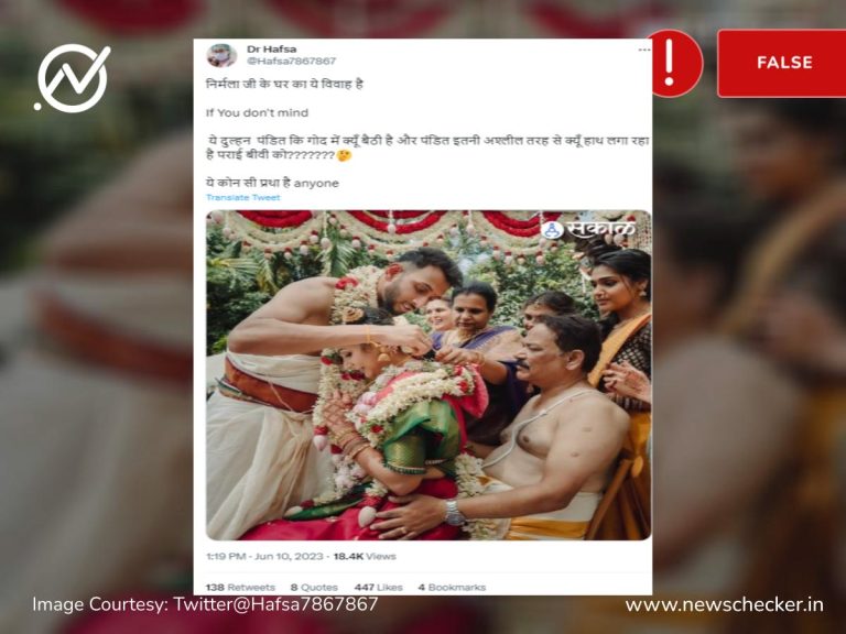एक तस्वीर के जरिए दावा किया जाने लगा कि निर्मला सीतारमण की बेटी अपनी शादी में पुजारी की गोद में बैठ गई। हमारी जांच में यह दावा भ्रामक साबित हुआ। पूरा फैक्ट चेक यहां पढ़ा जा सकता है।