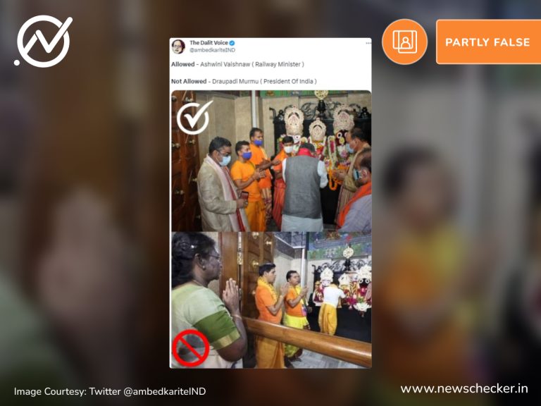 सोशल मीडिया पर एक पोस्ट को शेयर कर दावा किया जाने लगा कि राष्ट्रपति द्रौपदी मुर्मू को दिल्ली स्थित जगन्नाथ मंदिर के गर्भगृह में जाने से रोका गया। हमारी पड़ताल में यह दावा भ्रामक साबित हुआ। फैक्ट चेक यहां पढ़ा जा सकता है।