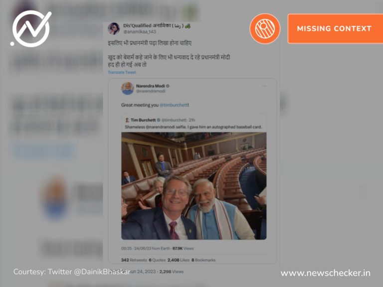 सोशल मीडिया के कई माध्यमों पर एक पोस्ट शेयर कर दावा किया जाने लगा कि अमेरिकी कांग्रेसमैन Tim Burchett ने प्रधानमंत्री नरेंद्र मोदी को ‘बेशर्म’ और ‘निर्लज्ज’ कहा है। हमारी जांच में यह दावा फर्जी साबित हुआ। फैक्ट चेक यहां पढ़ा जा सकता है।