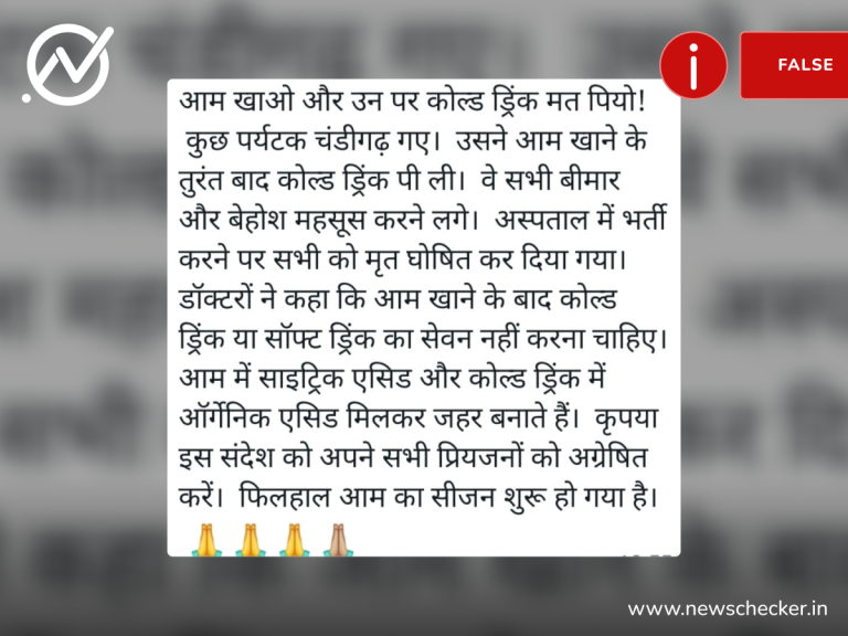 सोशल मीडिया पर आम और कोल्ड ड्रिंक्स को लेकर एक दावा तेजी से वायरल हो गया। दावा किया जाने लगा कि आम खाकर तुरंत कोल्ड ड्रिंक्स पीन से कुछ लोगों की मौत हो गई। हमारी जाँच से यह साबित हो गया कि वायरल दावा फर्जी है। पूरा फैक्ट चेक यहां पढ़ा जा सकता है।