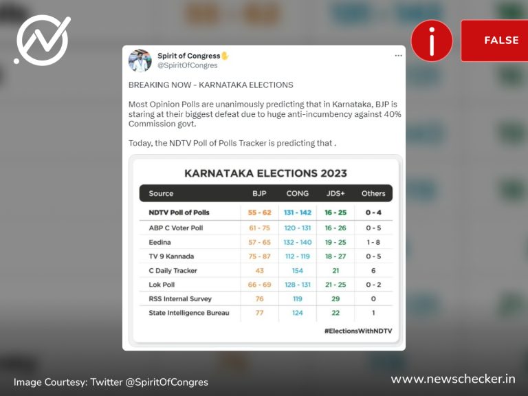 सोशल मीडिया पर एक ग्राफिक के जरिए दावा किया गया कि NDTV ने कर्नाटक में होने वाले चुनाव के लिए ओपिनियन पोल जारी किया है। इस पोल के जरिए संस्था ने कांग्रेस को बहुमत मिलने की बात की है. हमारी पड़ताल में यह दावा फर्जी निकला। फैक्ट चेक यहां पढ़ें।
