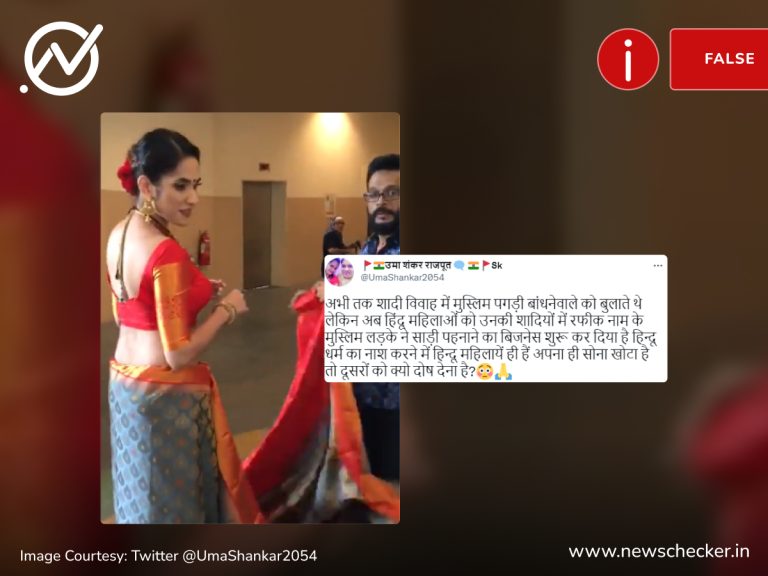 सोशल मीडिया पर एक वीडियो शेयर कर दावा किया गया कि रफीक नाम के एक मुस्लिम लड़के ने हिंदू लड़कियों को शादियों में साड़ी पहनाने का बिजनेस शुरू कर दिया है. हमारी जांच में यह दावा फर्जी साबित हुआ। फैक्ट चेक यहां पढ़ा जा सकता है।
