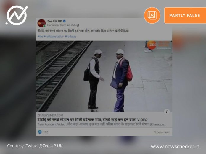 सोशल मीडिया पर एक रेलवे स्टेशन का वीडियो वायरल है, जिसमें दो व्यक्ति आपस में खड़े होकर बात कर रहे हैं, तभी अचानक ऊपर से कुछ गिरता हुआ नज़र आता है और एक व्यक्ति के शरीर से चिंगारी निकलने लगती है। वीडियो को खड़गपुर रलेव स्टेशन का बताकर शेयर करते हुए दावा किया जा रहा है कि इसमें नज़र आ रहे टीटीई की बिजली का तार गिरने के कारण मौत हो गई। हमारी पड़ताल में यह दावा भ्रामक साबित हुआ। पूरा फैक्ट चेक यहां पढ़ा जा सकता है।