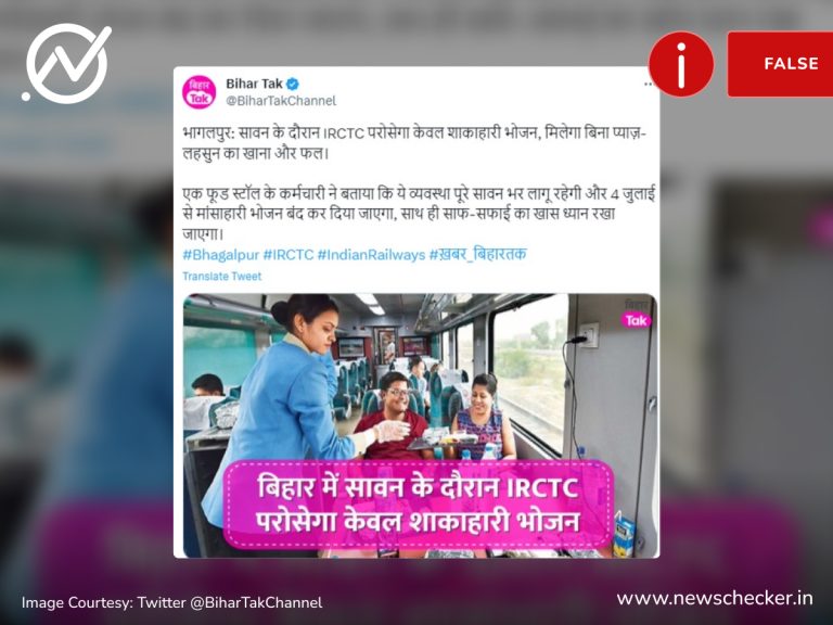 सोशल मीडिया सहित देश के कई मीडिया संस्थानों ने एक खबर प्रकाशित कर यह दावा किया कि सावन के महीने में भागलपुर स्टेशन पर नॉनवेज फूड नहीं परोसा जाएगा। हमारी पड़ताल में यह दावा फर्जी साबित हुआ। पूरा फैक्ट चेक यहां पढ़ा जा सकता है।