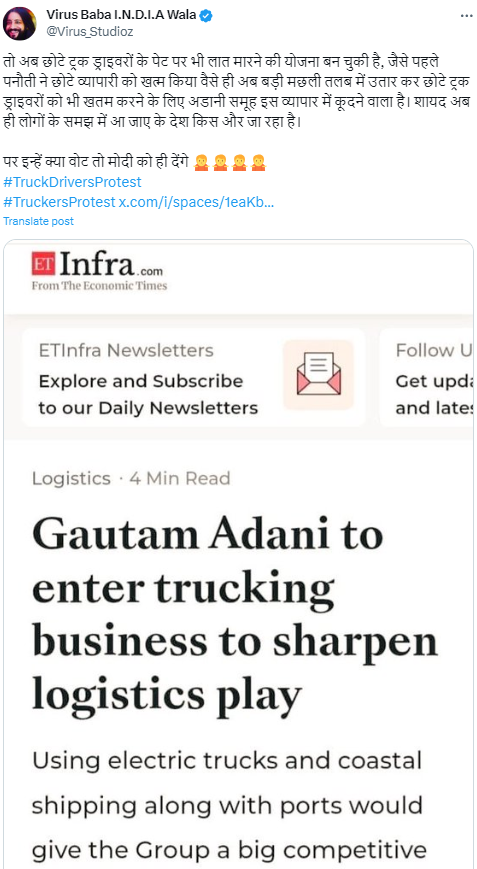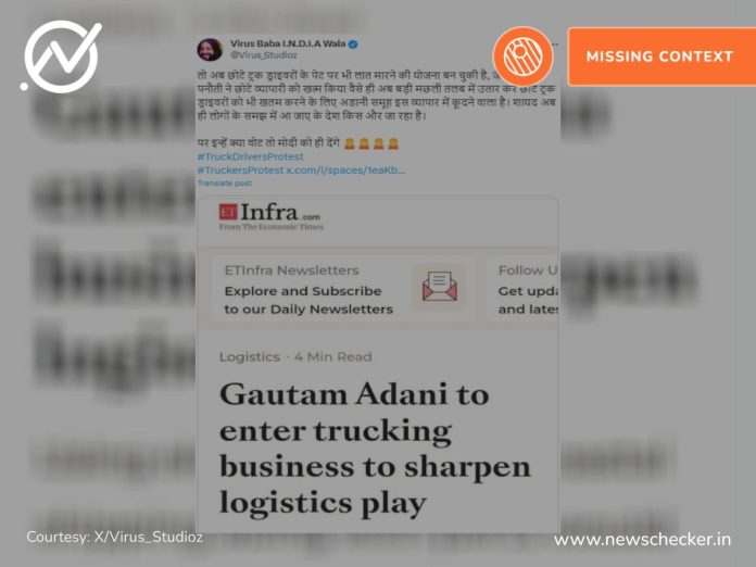 सोशल मीडिया पर एक तस्वीर शेयर कर यह दावा किया जा रहा है कि सरकार द्वारा ट्रक आदि वाहनों से जुड़े नए कानून लाने के बाद अडानी समूह ट्रक व्यवसाय में घुस कर छोटे ड्राइवरों का व्यापार खत्म करने वाला है. हालांकि हमारी पड़ताल में यह दावा भ्रामक साबित हुआ है. इस बारे में अधिक जानकारी के लिए पूरा फैक्ट चेक यहां पढ़ें.