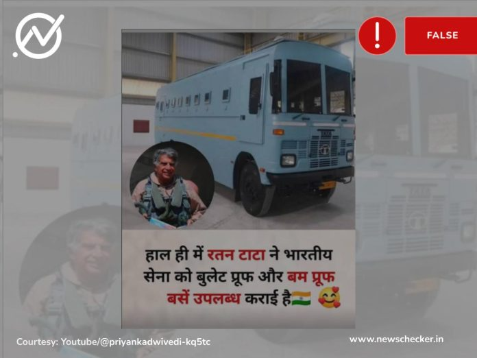 सोशल मीडिया पर वायरल हो रही तस्वीर में यह दावा किया जा रहा है कि उद्योगपति रतन टाटा ने भारतीय सेना को बुलेट प्रूफ और बम प्रूफ बसें उपलब्ध कराई हैं. हालांकि हमारी पड़ताल में यह दावा भ्रामक साबित हुआ है. इस बारे में अधिक जानकारी के लिए पूरा फैक्ट चेक यहां पढ़ें.