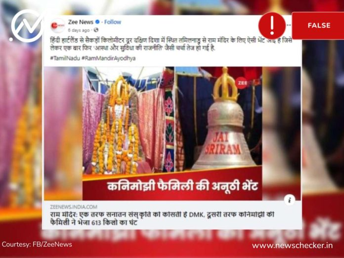 जी न्यूज़ समेत अन्य मीडिया आउटलेट्स ने यह दावा किया है कि तमिलनाडु की सत्ताधारी पार्टी डीएमके की सांसद कनिमोझी के परिवारजनों ने राम मंदिर के लिए 613 किलो का घंटा भेजा है. हालांकि हमारी पड़ताल में यह दावा भ्रामक साबित हुआ है. इस बारे में अधिक जानकारी के लिए पूरा फैक्ट चेक यहां पढ़ें.