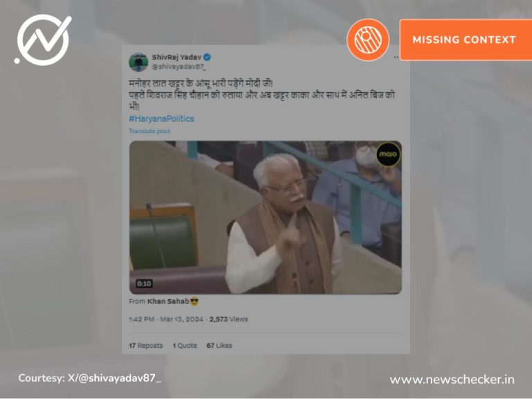सोशल मीडिया पर एक वीडियो को शेयर कर दावा किया जाने लगा कि हरियाणा के मुख्यमंत्री पद से इस्तीफा देने के बाद मनोहर लाल खट्टर भावुक हो गए। हमारी पड़ताल में यह दावा भ्रामक साबित हुआ। फैक्ट चेक यहां पढ़ें।