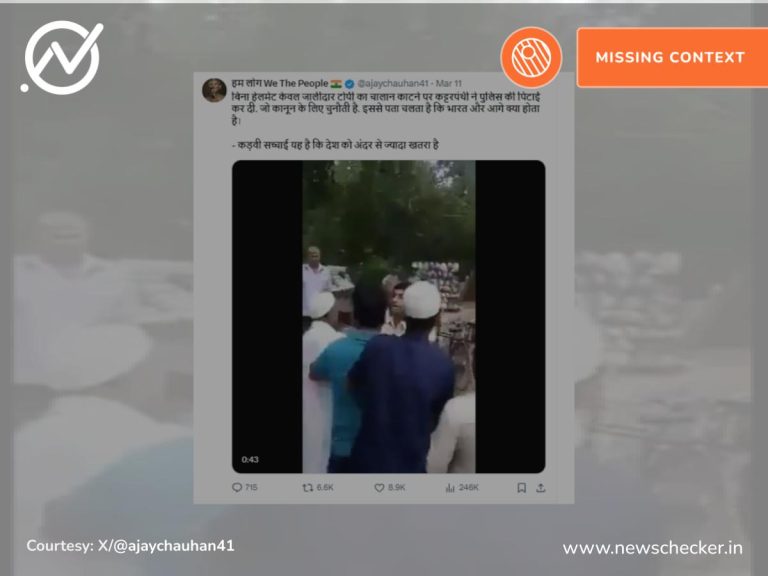 कुछ लोगों द्वारा एक ट्रैफिक पुलिसकर्मी की पिटाई किए जाने का वीडियो वायरल हो गया। वीडियो को शेयर कर दावा किया गया कि दिल्ली में कुछ कट्टरपंथियों ने गाड़ी का चालान करने पर पुलिसकर्मी को पीट दिया। हमारी जांच में यह दावा भ्रामक साबित हुआ। फैक्ट चेक यहां पढ़ें।