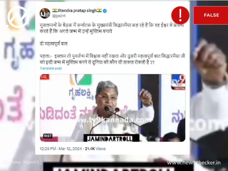 एक वीडियो शेयर करते हुए सोशल मीडिया यूजर्स ने दावा किया कि कर्नाटक के मुख्यमंत्री सिद्धारमैया ने कहा कि वे अगले जन्म में मुस्लिम बनना चाहते हैं। हमारी पड़ताल में यह दावा फर्जी साबित हुआ। फैक्ट चेक यहां पढ़ा जा सकता है।
