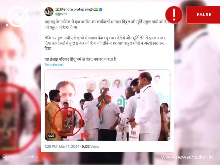 सोशल मीडिया यूजर्स ने एक वीडियो को शेयर कर दावा किया कि नासिक में मंच पर राहुल गांधी ने भगवान विट्ठल की मूर्ति लेने से इनकार कर दिया था। हमारी पड़ताल में यह दावा फर्जी साबित हुआ। फैक्ट चेक यहां पढ़ा जा सकता है।