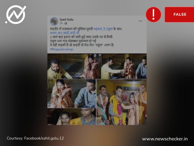 सोशल मीडिया पर एक सांप्रदायिक दावा तेजी से वायरल हो गया। दावा किया गया कि मंदसौर में इकरा नाम की मुस्लिम युवती ने राहुल वर्मा नाम के एक हिंदू से शादी की, लेकिन दो साल बाद इकरा की जली हुई लाश मिली और युवक भाग गया। हमारी पड़ताल में यह दावा फर्जी निकला। फैक्ट चेक यहां पढ़ा जा सकता है।