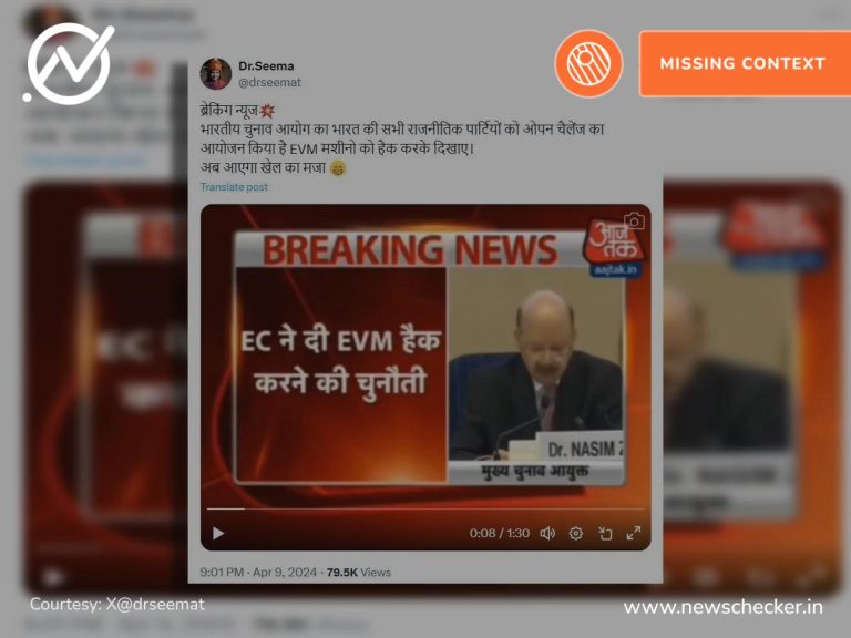 सोशल मीडिया पर एक वीडियो शेयर कर दावा किया गया कि भारत निर्वाचन आयोग ने राजनीतिक दलों को ईवीएम हैक करने का खुला चैलेंज दिया है। हमारी जांच में यह दावा भ्रामक साबित हुआ। फैक्ट चेक यहां पढ़ें।