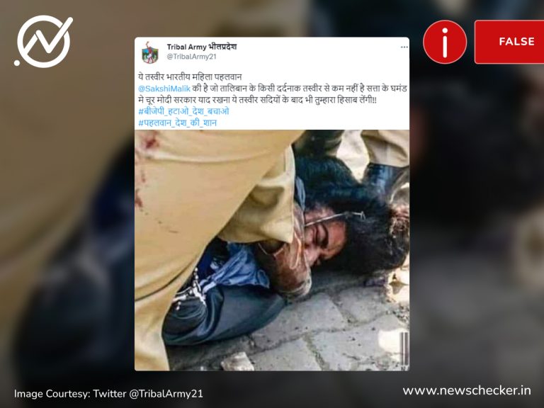 सोशल मीडिया के कई माध्यमों पर पुलिसिया दमन की एक तस्वीर वायरल हो गई। दावा किया जाने लगा कि प्रदर्शन के दौरान रेसलर साक्षी मलिक के चेहरे को दिल्ली पुलिस द्वारा कुचला गया। हमारी जांच में यह दावा फर्जी साबित हुआ। फैक्ट चेक यहां पढ़ा जा सकता है।