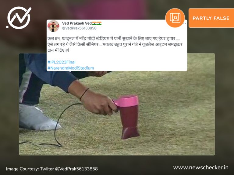 आईपीएल के इस सीजन के लिए खेले गए फाइनल मैच के दौरान तेज बारिश देखने को मिली। इसी बीच पिच को सुखाते एक हेयर ड्रायर की तस्वीर को नरेंद्र मोदी स्टेडियम का बताया जाने लगा। हमारी पड़ताल में यह दावा भ्रामक साबित हुआ। फैक्ट चेक यहां पढ़ा जा सकता है।
