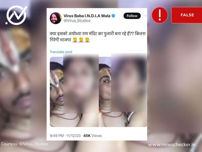 सोशल मीडिया पर एक अश्लील पोस्ट के जरिए दावा किया गया कि यह तस्वीर मोहित पाण्डेय नामक व्यक्ति की है, जिसे राम मंदिर का मुख्य पुजारी नियुक्त किया गया है। हमारी पड़ताल में यह दावा फर्जी साबित हुआ। फैक्ट चेक यहां पढ़ें।