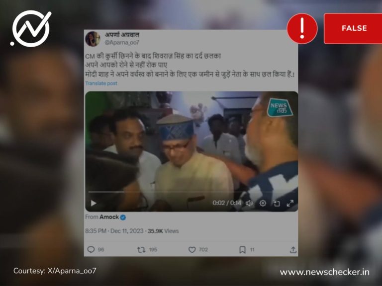 सोशल मीडिया यूजर्स ने दावा किया कि मुख्यमंत्री ना बन पाने से दुखी शिवराज सिंह चौहान फूट-फूट कर रोने लगे। हमारी जांच में यह दावा फर्जी निकला। फैक्ट चेक यहां पढ़ा जा सकता है।