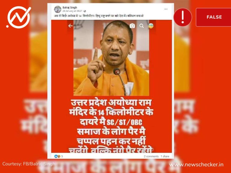 सोशल मीडिया पर एक पोस्ट को शेयर कर दावा किया गया कि अयोध्या राम मंदिर के 14 किमी के दायरे में पिछड़े और दलित चप्पल पहनकर नहीं चल सकेंगे। हमारी पड़ताल में यह दावा फर्जी साबित हुआ। फैक्ट चेक यहां पढ़ें।