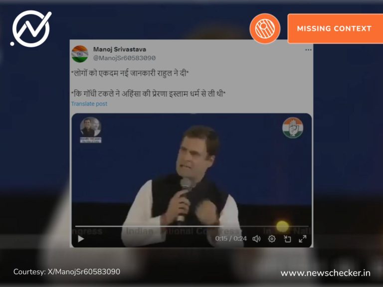 सोशल मीडिया पर एक पोस्ट को शेयर कर दावा किया गया कि कांग्रेस नेता राहुल गांधी ने कहा, “महात्मा गांधी को अहिंसा की प्रेरणा इस्लाम से मिली थी.” हमारी जांच में यह दावा फर्जी निकला। फैक्ट चेक यहां पढ़ें।