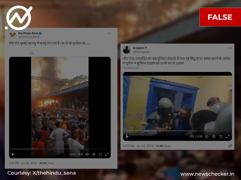 सोशल मीडिया पर दो अलग-अलग वीडियो वायरल होने लगे। एक वीडियो में जलते रेलवे स्टेशन को दिखया गया तो वहीं दूसरे वीडियो में कहा गया कि मीरा रोड इलाके में पुलिस युवाओं को घर से उठाकर ले जा रही है। हमारी जांच में यह पता चला कि दोनों ही वीडियो मीरा रोड इलाके के नहीं थे। फैक्ट चेक यहां पढ़ें।