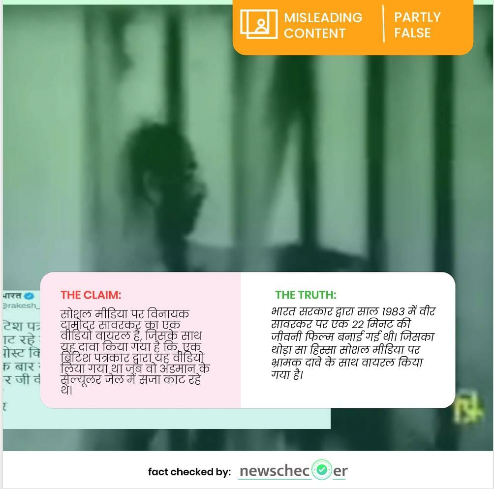 सोशल मीडिया पर स्वतंत्रता सेनानी विनायक दामोदर सावरकर के एक वीडियो के साथ दावा किया गया है कि यह उनका वह वीडियो है, जब वो अंडमान की जेल में सजा काट रहे थे। हमारी पड़ताल में पता चला कि यह एक डॉक्यूमेंट्री की क्लिप है।