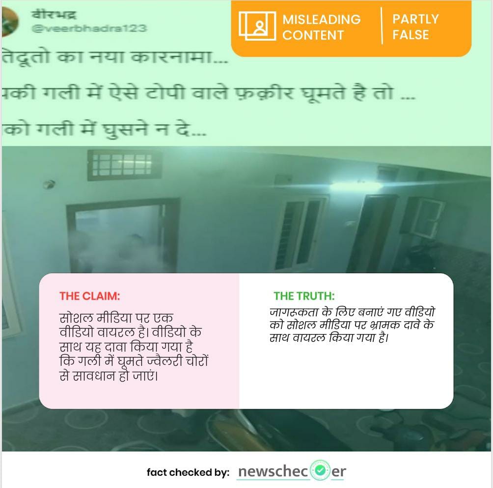 सोशल मीडिया पर एक वीडियो के साथ दावा किया गया कि ‘गली में घूमते ज्वैलरी चोरों से सावधान रहें। वीडियो में यह दिखाया गया है कि दो व्यक्ति धोखे से एक परिवार के गहने लूट लेते हैं। हमारी पड़ताल में पता चला कि जो वीडियो वायरल हुआ था वह सिर्फ लोगों को जागरूक होने के लिए बनाया गया था।