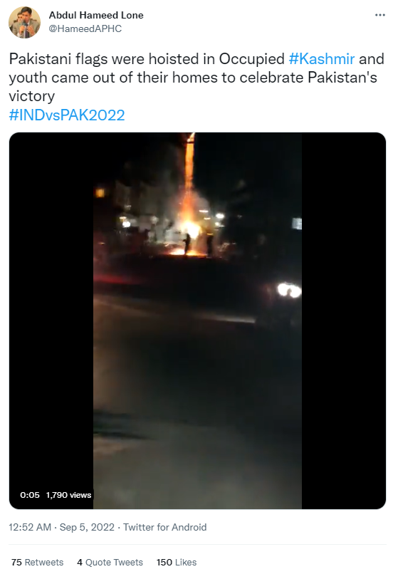 सोशल मीडिया पर एक वीडियो शेयर कर दावा किया गया कि एशिया कप में पाकिस्तान की जीत के बाद कश्मीर में जश्न मनाया गया. हमारी पड़ताल में यह दावा भ्रामक साबित हुआ। फैक्ट चेक यहां पढ़ा जा सकता है।