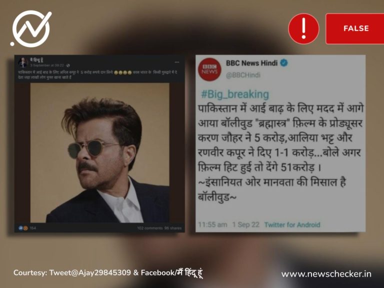 सोशल मीडिया पर एक पोस्ट शेयर कर दावा किया गया कि आलिया भट्ट, करण जौहर, रणबीर कपूर और अनिल कपूर जैसे बॉलीवुड सितारों ने पाकिस्तानी बाढ़ पीड़ितों की मदद के लिए करोड़ों रुपये दान किए हैं। हमारी पड़ताल में पता चला कि बीबीसी हिंदी के नाम पर फर्जी पोस्ट शेयर की गई थी। फैक्ट चेक यहां पढ़ा जा सकता है।
