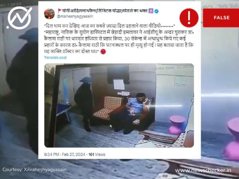 सोशल मीडिया पर एक वीडियो को शेयर कर दावा किया गया कि एक मुस्लिम शख्स ने नासिक के डॉक्टर कैलाश राठी पर आईसीयू में घुसकर हमला कर दिया। इस हमले से डॉक्टर की मौके पर ही मौत हो गई। हमारी जांच में यह दावा भ्रामक साबित हुआ। फैक्ट चेक यहां पढ़ा जा सकता है।