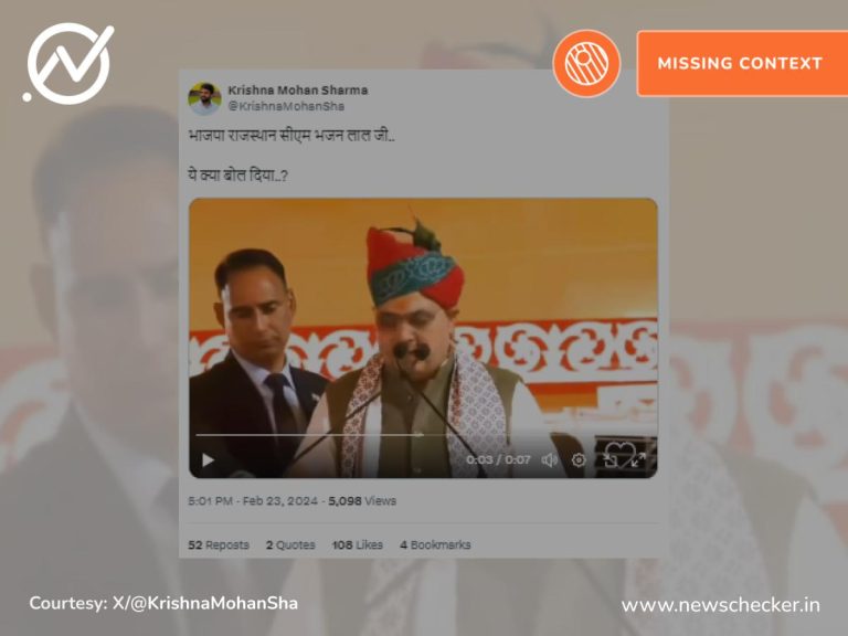 सोशल मीडिया पर एक वीडियो के जरिए दावा किया गया कि राजस्थान के मुख्यमंत्री भजनलाल शर्मा ने बीजेपी को जुमलों की पार्टी बताया है। हमारी जांच में यह दावा फर्जी निकला। फैक्ट चेक यहां पढ़ें।