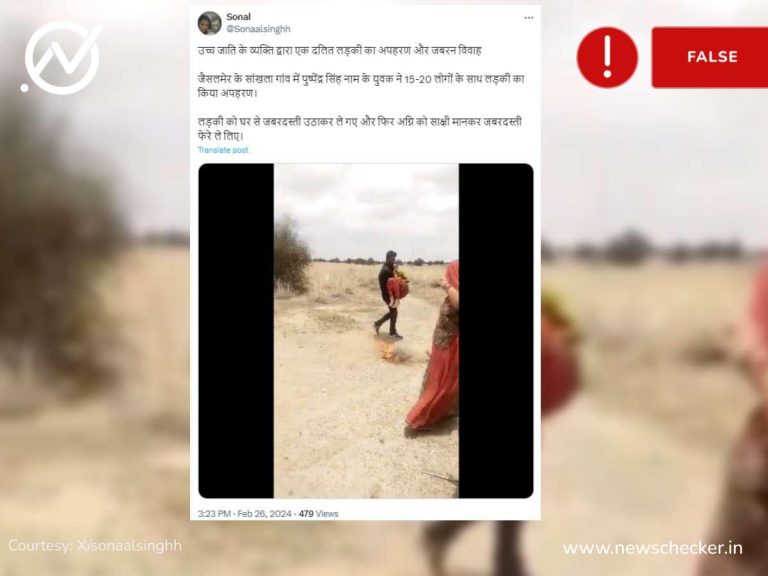 सोशल मीडिया यूजर्स ने एक वीडियो को शेयर कर दावा किया कि जैसलमेर में उच्च जाति के व्यक्ति ने दलित लड़की का अपहरण कर उसके साथ जबरन शादी कर लिया। हमारी पड़ताल में यह दावा भ्रामक साबित हुआ। फैक्ट चेक यहां पढ़ें।