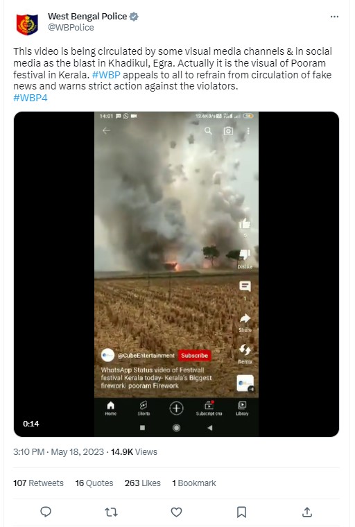 पड़ताल के दौरान हमें पश्चिम बंगाल पुलिस के ट्विटर हैंडल से 18 मई, 2023 को किया गया एक ट्वीट भी मिला। इसमें वायरल वीडियो का दृश्य भी मौजूद है। पश्चिम बंगाल पुलिस ने दावे का खंडन किया है। ट्वीट के कैप्शन में लिखा है, “इस वीडियो को कई मीडिया चैनलों और सोशल मीडिया पर एगरा के खादिकुल में हुए विस्फोट का बताकर शेयर किया जा रहा है। दरअसल, यह वीडियो केरल में आयोजित होने वाले पूरम उत्सव का है। पश्चिम बंगाल पुलिस इस तरह की सभी फर्जी खबरों को शेयर न करने की अपील करता है। इसका उल्लंघन करने वालों पर कड़ी कार्रवाई हो सकती है। ”