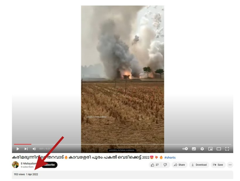 वायरल क्लिप का लंबा वर्जन हमें E Malyalam नामक यूट्यूब चैनल पर 1 अप्रैल, 2022 को अपलोड किए गए एक वीडियो में मिला। वीडियो के टाइटल में मलायलम में लिखा है, “पटाखे बनाने वाली जगह कवासेरी में ‘पूरम दिवस’ के मौके पर 2022 में हुई आतिशबाजी।”