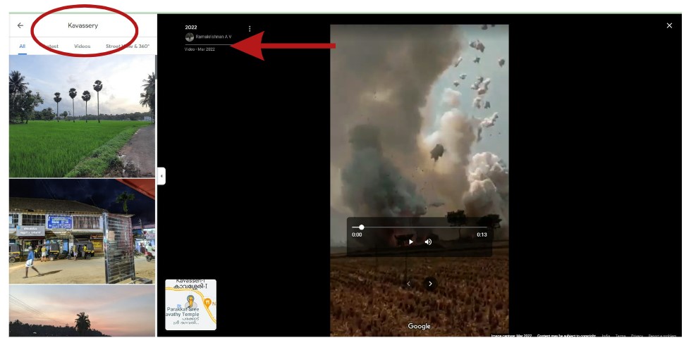 इसके अलावा, हमने केरल के कवासेरी के कई वीडियो और तस्वीरों को गूगल पर सर्च किया। हमें वायरल वीडियो मार्च 2022 में Ramakrishnan A V द्वारा गूगल पर अपलोड किए गए एक पेज में मिला। हालांकि, इस वीडियो में वायरल वीडियो वाला ऑडियो मौजूद नहीं है। गूगल इमेज के अनुसार, यह कवासेरी का दृश्य है।