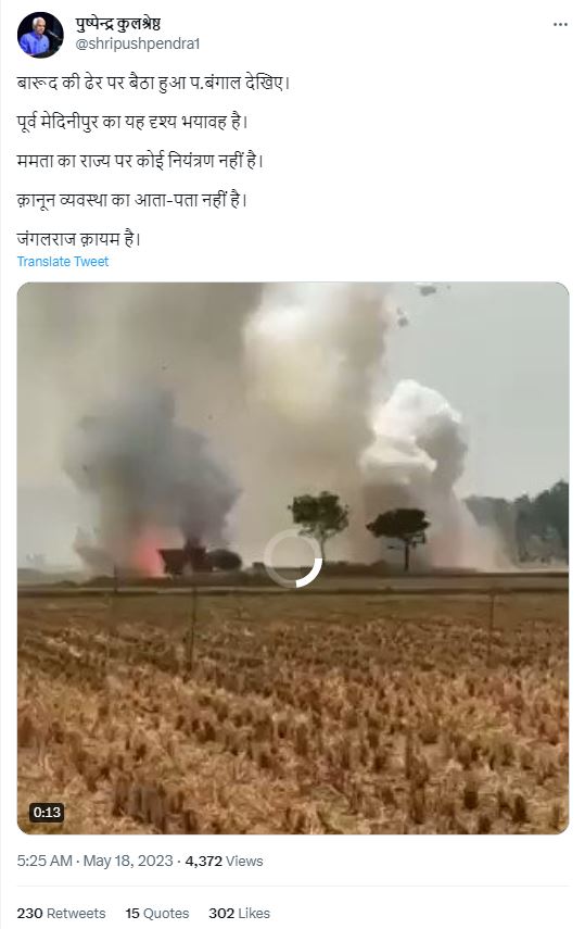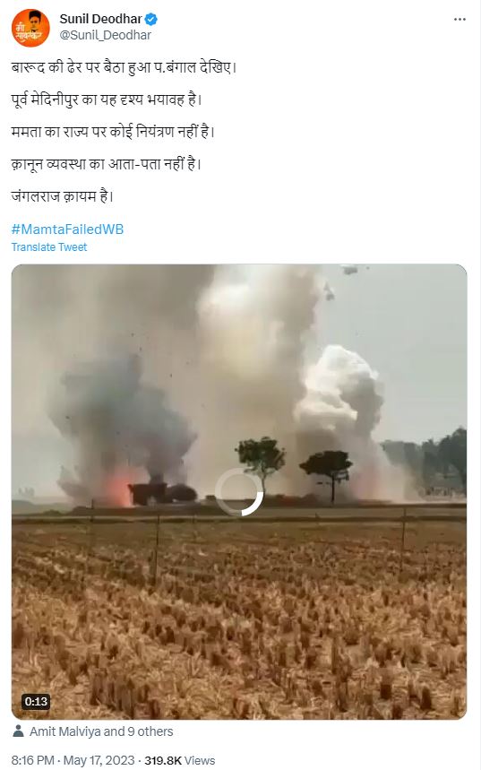 पश्चिम बंगाल के मिदनापुर स्थित खड़ीकुल गांव में बीते दिनों एक अवैध पटाखा फैक्ट्री में हुए विस्फोट में कम से कम नौ लोगों की मौत हो गई और कई अन्य घायल हो गए। इसी से जोड़ते हुए कई सोशल मीडिया यूजर्स ने एक ब्लास्ट का वीडियो शेयर करते हुए दावा किया कि यह पश्चिम बंगाल के पूर्वी मिदनापुर जिले में हुए हालिया विस्फोट का वीडियो है। वीडियो के जरिए पश्चिम बंगाल सरकार पर भी निशाना साधा जा रहा है।