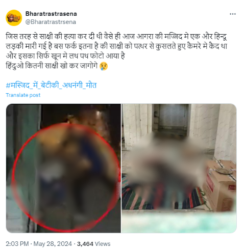 एक एक्स यूज़र ने 28 मई 2024 को शव की तस्वीर को शेयर करते हुए कैप्शन में लिखा है, “जिस तरह से साक्षी की हत्या कर दी थी वैसे ही आज आगरा की मस्जिद मे एक और हिन्दू लड़की मारी गई है। बस फर्क इतना है की साक्षी को पत्थर से कुचलते हुए कैमरे मे कैद था और इसका सिर्फ खून मे लथ पथ फोटो आया है हिंदुओ कितनी साक्षी खो कर जागोगे।”