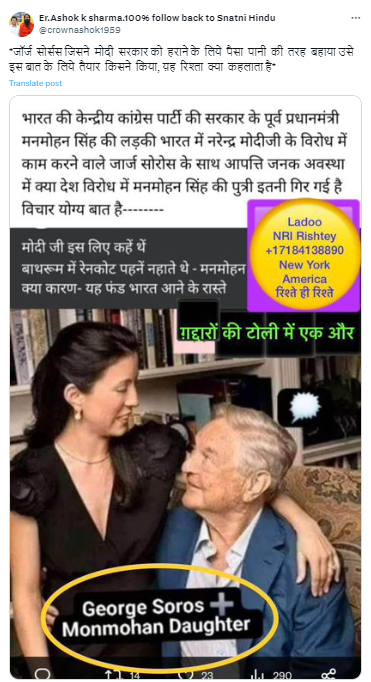 इस फोटो के पर लिखा है, “भारत की केन्द्रीय कांग्रेस पार्टी की सरकार के पूर्व प्रधानमंत्री मनमोहन सिंह की लड़की भारत में नरेन्द्र मोदीजी के विरोध में काम करने वाले जार्ज सोरोस के साथ आपत्ति जनक अवस्था में क्या देश विरोध में मनमोहन सिंह की पुत्री इतनी गिर गई है विचार योग्य बात है।” इस फोटो के साथ कैप्शन में लिखा है, “जॉर्ज सोर्सस जिसने मोदी सरकार को हराने के लिये पैसा पानी की तरह बहाया उसे इस बात के लिये तैयार किसने किया, य़ह रिश्ता क्या कहलाता है।”