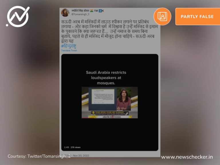 सोशल मीडिया पर एक वीडियो शेयर कर यह दावा किया गया कि सऊदी अरब द्वारा मस्जिदों में लाउडस्पीकर पर प्रतिबंध लगा दिया गया है। हमारी पड़ताल में यह दावा फर्जी साबित हुआ। फैक्ट चेक यहां पढ़ा जा सकता है।