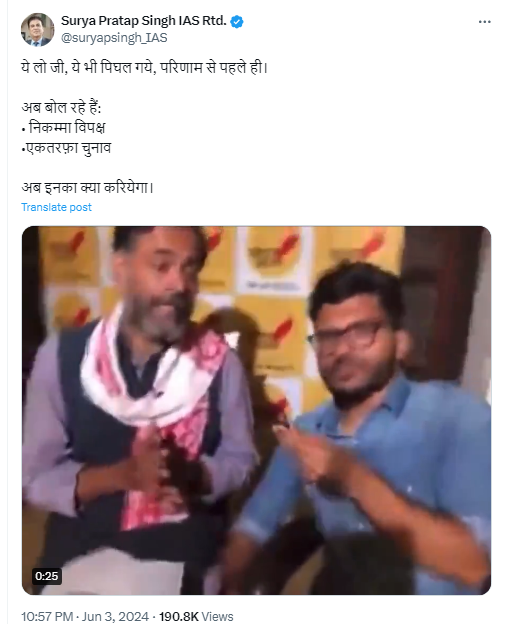 वायरल वीडियो करीब 46 सेकेंड का है, जिसमें योगेंद्र यादव ये कहते नजर आ रहे हैं कि ”भारतीय जनता पार्टी इस चुनाव में आगे है और ये जो हम लोग घूम रहे थे. मैं अपनी आशा में और अपने आकलन में हमेशा अंतर करता हूं. हमारी पार्टी, हम सब, हम सब का मानना रहा है कि भारतीय जनता पार्टी का दोबारा आना इस देश के लिए बहुत बड़ा खतरा है. लेकिन ये सोचने का मतलब थोड़ी है कि आप कबूतर की तरह आंख बंद कर लो और देखो कि ये हो नहीं रहा है. सच्चाई यह है कि एक तरफ़ा चुनाव था, विपक्ष निहायत निकम्मा साबित हुआ. दो बड़ी चीजें हुई विपक्ष का निकम्मापन और मीडिया का एक तरफ़ा व्यवहार, इन दोनों चीजों ने इस चुनाव को इतना स्पष्ट रूप से भारतीय जनता पार्टी के पक्ष में कर दिया. जिसका परिणाम हम देख रहे हैं.