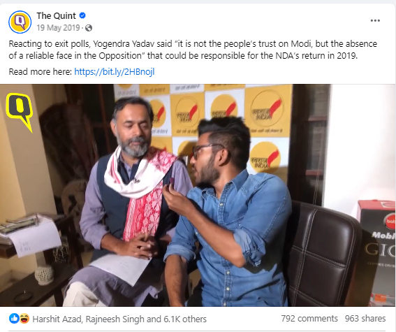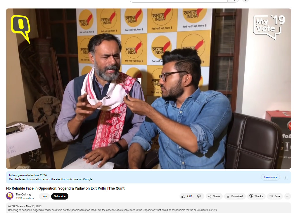 इसके अलावा हमें द क्विंट के फेसबुक अकाउंट से 19 मई 2019 को अपलोड किया हुआ यह वीडियो मिला, जिसमें योगेंद्र यादव को ये बातें कहते हुए सुना जा सकता है.