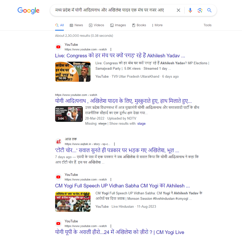 मध्य प्रदेश में योगी आदित्यनाथ और अखिलेश यादव के एक मंच पर नजर आने के नाम पर शेयर किए जा रहे इस दावे की पड़ताल के लिए हमने ‘मध्य प्रदेश में योगी आदित्यनाथ और अखिलेश यादव एक मंच पर नजर आए’ कीवर्ड्स को गूगल पर ढूंढा. इस प्रक्रिया में हमें कोई भी ऐसी मीडिया रिपोर्ट नहीं मिली जिससे वायरल दावे की पुष्टि की जा सके, जबकि किसी मुख्यमंत्री के अपनी ही पार्टी से बगावत करना बहुत बड़ी खबर है.