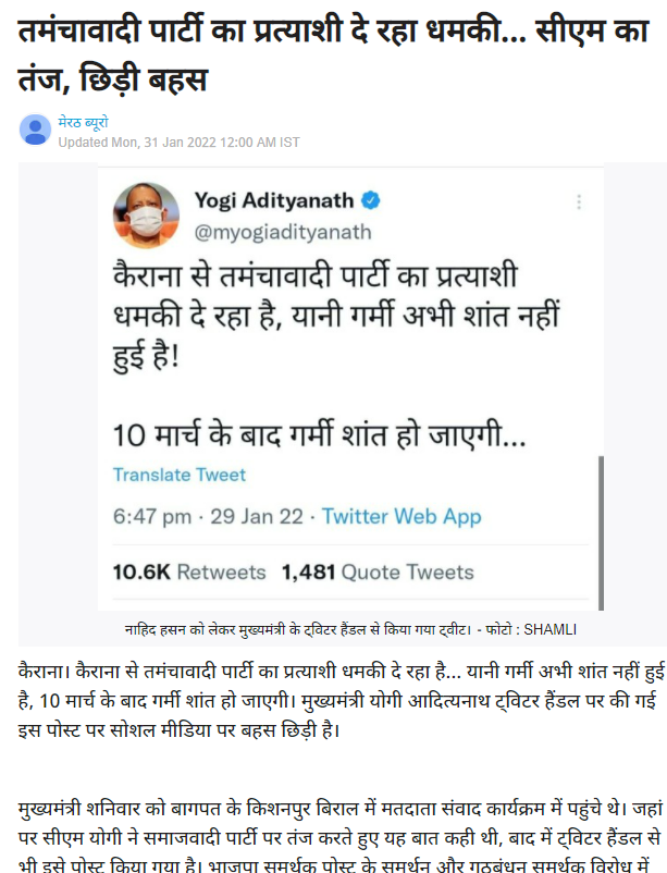 हमने अपनी पड़ताल के दौरान कुछ कीवर्ड की मदद से ट्विटर पर सर्च करना शुरू किया। इस दौरान हमें योगी आदित्यनाथ के ट्वीटर हैंडल द्वारा 29 जनवरी 2022 को किया गया एक ट्वीट प्राप्त हुआ, जिसमें लिखा है, “कैराना से तमंचावादी पार्टी का प्रत्याशी धमकी दे रहा है, यानी गर्मी अभी शांत नहीं हुई है! 10 मार्च के बाद गर्मी शांत हो जाएगी…”