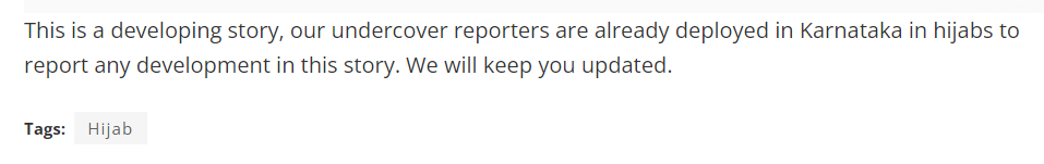इस लेख के अंत में लिखा है, “यह एक डेवलपिंग स्टोरी है, इस टॉपिक पर होने वाली किसी भी डेवलपमेंट की रिपोर्ट कवर करने के लिए हमारे अंडरकवर रिपोर्टर हिजाब पहनकर पहले से ही कर्नाटक में तैनात हैं। हम आपको अपडेट देते रहेंगे।”