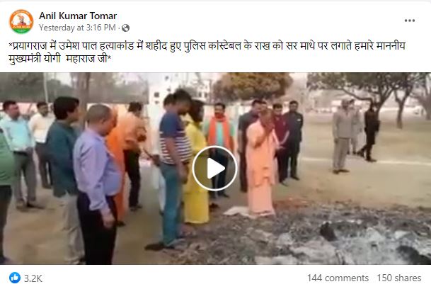 सोशल मीडिया पर यूपी के CM योगी आदित्यनाथ का एक वीडियो वायरल है, जिसे शेयर कर दावा किया जा रहा है कि उन्होंने एक शहीद कांस्टेबल की राख को अपने माथे पर लगाया। करीब 30 सेकेंड के इस वीडियो में योगी आदित्यनाथ जमीन पर पड़ी राख को अपने माथे पर लगाते हुए नज़र आ रहे हैं।