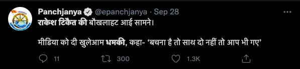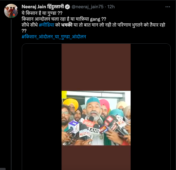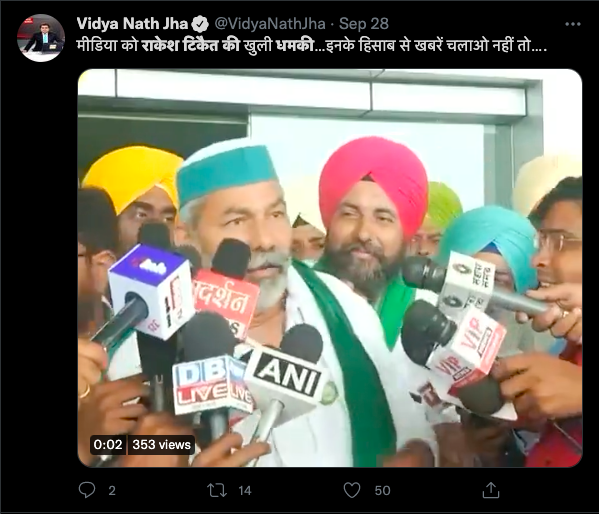 सोशल मीडिया पर इस बीच राकेश टिकैत का एक वीडियो वायरल हो रहा है। दावा किया जा रहा है कि राकेश टिकैत ने अब मीडिया को खुलेआम धमकी दी है। वीडियो के साथ लिखा जा रहा है कि राकेश टिकैत का अगला टार्गेट मीडिया हाउस हैं।