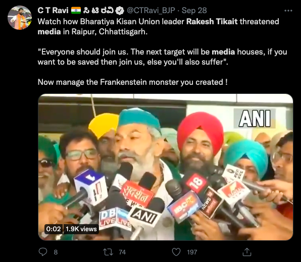 ANI द्वारा पोस्ट किए गए इस वीडियो में टिकैत 0:15s पर बोलते हैं, “मैन तो उसे दिल्ली वाले को देख लो..जिसनै कानून बनाकै आधा देश बेच दिया…उसमें भी ध्यान बना लो… मंडियां बेच दीं मध्य प्रदेश की 182 मंडियां बेचनी निकाल दीं…छत्तीसगढ़ भी अछूता नहीं रेहणे का…अब तो ये है कि सब लोग साथ दो…अगला टार्गेट मीडिया हाउस है…आपको बचना है तो साथ दे दो नहीं तो आप भी गए…धन्यवाद जी।”