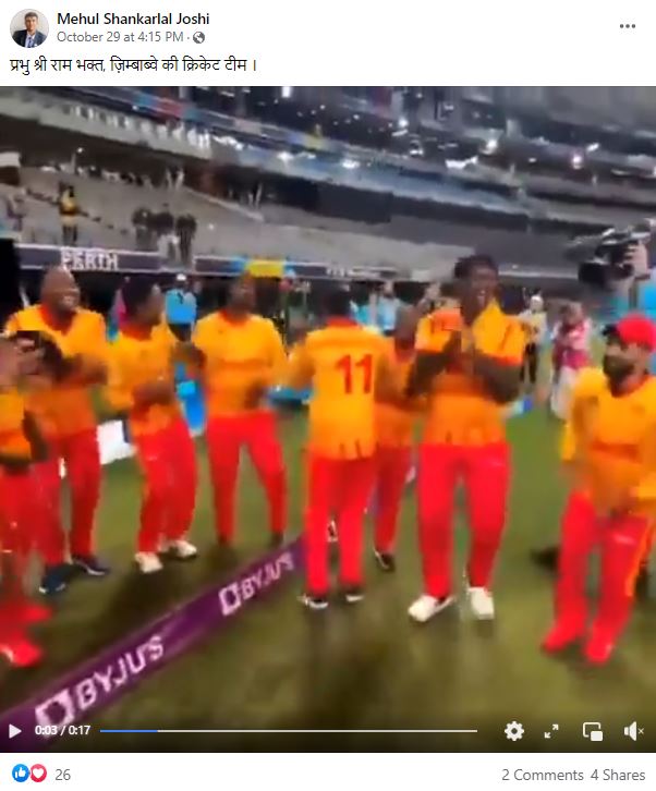 सोशल मीडिया पर जिम्बाब्वे के क्रिकेट खिलाड़ियों का एक डांस वीडियो वायरल है। वीडियो के साथ दावा किया जा रहा कि पाकिस्तान के खिलाफ मैच जीतने के बाद इन प्लेयर्स ने जय श्री राम गाने पर डांस किया।