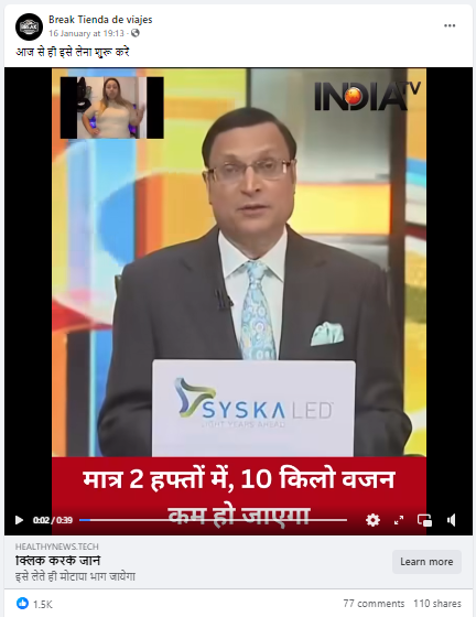 सोशल मीडिया पर एक पोस्ट के माध्यम से यह दावा किया जा रहा है कि एक ख़ास दवाई खाने से 20 हजार लोगों ने 2 हफ़्तों के अंदर 10 किलो तक वजन कम किया है। ये दावा ‘Break Tienda de viajes’ नामक फेसबुक पेज से किया गया है। 16 जनवरी, 2024 को साझा किये गए एक वीडियो को दो दिन में 1500 लोगों द्वारा लाइक किया जा चुका है। हालांकि, वीडियो में किसी दवा का नाम नहीं बताया गया है बल्कि एक लिंक पर क्लिक करने के लिए कहा गया है।