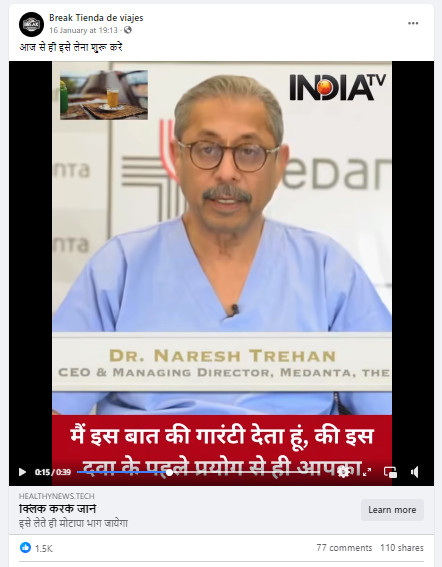 करीब 40 सेकंड के इस वीडियो की शुरुआत में पत्रकार रजत शर्मा को दिखाया गया है, जो कह रहे हैं कि ”मात्र 2 हफ़्तों में 10 किलो तक वजन कम हो जाएगा। ऐसा उस भारतीय डॉक्टर का कहना है, जिन्होंने ये दवाई बनाई है। जो किसी भी मोटापे से परेशान व्यक्ति का मोटापा दूर कर देती है।” इसके बाद वीडियो में मेदांता के मैनेजिंग डायरेक्टर डॉ नरेश त्रेहन दिखते हैं, वे कहते दिखते हैं कि ”मैं इस बात की गारंटी देता हूँ कि इस दवा के पहले प्रयोग से ही आपका वजन सामान्य हो जाएगा और केवल 2 हफ़्तों में 10 किलो तक वजन कम कर लेंगे और मोटापा हमेशा के लिए दूर हो जाएगा और कभी लौट कर नहीं आएगा आप अपना वजन घटता हुआ खुद महसूस करेंगे। जी हाँ, अभी तक 20 हज़ार लोगों ने इसका इस्तेमाल करके मोटापे से छुटकारा पाया है। नीचे दिए गए बटन पर क्लिक करें और अधिक जानें, आज प्रमोशन का आखिरी दिन है।”