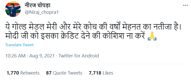 भारत के लिए एथलेटिक्स में पहला स्वर्ण पदक जीतने वाले नीरज चोपड़ा के नाम पर कई फर्जी ट्विटर हैंडल्स बनाये गए. ऐसे ही एक फर्जी ट्विटर हैंडल से एक ट्वीट शेयर कर यह बयान दिया गया कि, “ये गोल्ड मेडल मेरी और मेरे कोच की वर्षों मेहनत का नतीजा है। मोदी जी को इसका क्रेडिट देने की कोशिश ना करें”.